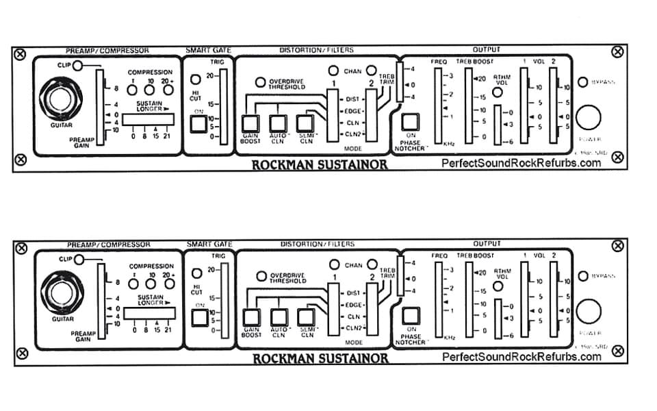 1) Route the output of the post-Sustainor EQ to the input of the Stereo Chorus/Delay module. 2) Route the MONO (left) output of the Chorus/Delay to the input of the Stereo Chorus module. 3) Route the left and right outs of the Stereo Chorus module into the left and right inputs of the Stereo Echo module. What you have basically done is build a chain where you can get rhythm and lead Choruses and Delays, depending on the situation at hand. Set the Chorus/Delay module chorus functions as follows: 1) For sweep speed, raise the speed to NORM or above. Set the output mix for mono. This gives you a very lush Chorus, great for Cln or Cln 2 modes. 2) Set the Delay up for a comfortable slapback when playing rhythm guitar and set your delay volume to your personal liking. Now, set your output mix to Subtle or Mono. Using your foot-switchable functions, you can now switch between a lush Chorus and a nice slapback delay for rhythm. Set the Stereo Chorus module functions as follows: 1) Set your output mixes 1 and 2 for Stereo and Wide, respectively. 2) Use the foot-switchable Long Chorus function for kicking in Long Chorus during soaring lead riffs and solos. 3) Set your sweep speed lower than the NORM setting, for a smoother Chorus that won't chop up your signal, allowing better control and achievement of harmonic feedback when playing solos. Lastly, set your Stereo Echo module up for the longest echo time (300-500ms) and feedback setting to fit your soloing needs. I usually keep the output switch in the middle position, as it seems to be the best default setting. (Summary) Following the above guidelines, you have basically put together here is one of the most useful setups a guitarists can have, making use of the best features on each respective module. The Chorus/Delay gives you a very lush and wet chorus for majestic cleans or super fat rhythm, while switching to delay gives you a straight ahead slapback, making those chunky power chords sound a bit chunkier. The Stereo Chorus module gives you a fuller, rounder chorus, specifically set up for soaring lead lines and super long sustaining chords. Kicking in the Long Chorus widens your mix even more. The Stereo Echo is now set up for your leads or for rich echo in your Clean 1 and Clean 2 modes. Use of a Midi-Octopus to access the footswitchable functions is where the magic begins. I use two Octopi on all my rigs; so, don't get caught up with only having one Octopus. Remember, the more Octopi, the more midi-controlled functions you can access. Here is a printable Stereo Chorus/Delay and Stereo Chorus user settings template for your reference. PerfectSound Rock Refurbs will totally refurb your Rockmodules to like new condition. Which Rockmodule can we refurb for you? ![]() The first Sustainor was the Model 100 (left picture), which for it's time, sounded absolutely awesome. Most Sustainors have the model number printed on the rear panel, along with the date of birth, and serial number. From a layman's point of view, the 100 is a dirtier sounding unit, the distortion being more grainy/gritty, with a lesser degree of compression. The Clean modes sound a bit thinner than later models. The Model 100a was next in line, probably having slight improvements in s/n ratio, etc. Model 100 and 100a sound very similar in their characteristics. A notable difference in tone came with the Model 200 (right picture), with it's much smoother and refined filters and compression characteristics. The Model 200 Cleans are rounder in sound...more natural, especially noticeable in the Clean 2 mode. Late Model 200 Sustainors contained the addition of the Lead Leveler circuit, a circuit that was also found in the programmable XPR/XP preamps. This circuit was designed with the most demanding players in mind, i.e. players that did a lot of finger tapping, hammer-ons, fast staccato scales, etc. The lead leveler kept these quick runs from turning into mush. The key point here is this: All Sustainors sound good, but not all of them sound great. I use one Model 100a, umpteen Model 200's, and 6 late Model 200 Lead Leveler units. What I have found is that no matter what Sustainor you own, a loop EQ is absolutely necessary to bring out it's good points. This being said, I can make a 100 sound as good as a 200. The only reason I favor the 200's is that I prefer smoother compression over more distortion. This, and the fact that the late Model 200's are highly collectible is what made me switch. But, for someone on a budget who isn't a big collector, a Model 100/100a is just what you need and more!! Trust me; these units don’t disappoint, unless one needs a good refurb. Don't get too caught up in the late model Sustainors if you aren't a serious lead player. The difference between the 200 and the Lead Leveler 200 is subtle. If you are like me and grew up playing in the 80's, chances are you will notice the difference. If you are into thrash, grunge, hippity hoppity, thrash metal, hip-hop thrash, thrash-grunge, funkadelic-thrash or thrash-thrash, metal-metal, or be-bop thrash...you won't hear the difference. In this case, just go with a Model 100, throw it on the ground a couple of times to loosen some of the components, and you should get a record deal. Here is a printable Sustainor 100 and Sustainor 200 user settings template for your reference. ![]() Many people have asked, "Hey Dave, what the hell is a Double IC Sustainor, and do I have one?" If I'm eating dinner, I will usually tell `em to get lost, especially if Shrimp A La Mexicana with a Jumbo Margarita is on the menu. But, that is another article all together, and I'm not eating right now, so... In the late 80's, around 1989 or so, the standard Model 200 Sustainor was upgraded with Bob Cedro's Lead Leveler circuit, which accommodated staccato playing styles popular at the time (think "shredders"). Physically, the addition of the lead leveler was basically (among other things) the addition of a few more components squeezed on to 