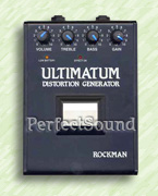First, in every rig I own, I use two Sustainors. The first is used for Cln 1 and Cln 2. It has a Rockman EQ in the effects loop to cut the highs/mids, add warmth, and boost the lows. The second Sustainor is used for Edge and Distortion. It has a Rockman Smart Gate module followed by a Rockman EQ in the effects loop. This EQ is used to boost the lows, severely cut the lower mids, and tailor the high mids for presence. Everything above 2K in this EQ is totally cut. What I have just shared with you is what I believe to be the heart of all things Rockman, as far as Sustainors go. It is important to understand that Model 100's or 200's can be used and will both sound absolutely awesome if the system is put together right. That being said, I suggest using a 100 for your Cleans and a 200 for your Distortions. If you don't have a 200, use a 100 for your Distortion settings. With the right EQing in the loop, it will sound fantastic, capable of blowing any other preamp away, . Before I go any further, I want to mention patch cords. Patch cords can literally make or break a guitar system. If you choose to go cheap, your rig will sound cheap. Patch cords need to be high quality and as short as possible in any long analog chain. I have spent 200 to 300 dollars in a few of my rigs just to have the best money can buy. I suggest Monster, Mogami, or for bargain hunters, Pro Co Excellines. If it is at all possible, I suggest using a High Quality wireless unit instead of a guitar cord. The Sustainor compressor circuit just loves guitar cord noise!!! Now, after the Sustainors comes the post-Sustainor EQ. This Rockman EQ is meant to refine and condition the Sustainor signal before going into the next module, the Stereo Chorus. This EQ is great because you can really boost the signal where it needs to be going into the chorus. Remember, throughout the chain, you are trying to keep the signal to noise ratio up. In other words, you are boosting and cutting throughout the chain, yet keeping the outputs nice and hot going into each module. Note, I have outlined a way of chaining the Rockman Chorus/Delay and Rockman Stereo Chorus modules together for you adventurous types. But, that's in a past article. Please read that article if you would like to know more about that, :) So, anyway, you've come out of the post-Sustainor EQ and into the Rockman Chorus. From the Rockman Stereo Chorus module, the signal is fed into the Rockman Stereo Echo. Remember to plug the left and right signals coming from the Chorus into the proper left and right inputs of the Echo. The dry signal is always on the left and the processed signal is always on the right. From the Stereo Echo, use an Ebtech Line Level Shifter to boost the signal level from a line level to a professional sound signal level. This will boost your signal going into the stereo PA power amp. If you do not use a LLS, the line level signal will not drive your power amp very efficiently at all. This means, you will need to crank your power amp to achieve normal volume levels. Finally, adding a Rockman Midi Octopus to the rig allows everything to be switched via a midi footcontroller. Your midi foot controller can be any brand, although the Rockman unit looks cool and may help you get chicks, :) The stereo power amp you choose to use should be a PA power amp. Stay away from guitar rack power amps, as they have limited frequency response and are tailored more for traditional preamps, which the Rockman modules are not!! The Rockman Speaker Cabinets SR&D; originally built are essentially large three-way stereo speakers or PA speakers. They contain a 15" woofer, a 10" midrange speaker, and a bullet tweeter. The speakers are wired with a 3-way crossover. These cabinets are not vented. They are sealed. This being said, it should be clear at this point that the Rockman Rockmodules were designed around the full range concept. Although other types of speakers can be used and may sound good, they are not capable of recreating much of the high and low frequencies associated with the Sustainor, especially in the Clean 2 mode, and especially at high volumes. Keep on Rockin' ![]() As I sit and ponder about the Ultimatum, the first thing that comes to mind is that this pedal can either sound like the best distortion pedal ever conceived, or the worst piece of technical gadgetry ever designed. Personally, I bumbled through the latter train of thought before I stumbled onto some truly amazing things about this mysterious of all Rockman pedals. In fact, when I purchased my first one, I thought there was something wrong with it and took it back. Once I found the "secret", I ran right back out and bought four of them, searching every music store in Detroit until my obsessive thirst for tone ebbed. So, what is it about this pedal that makes it unique? Well, first and foremost, it ISN'T a Boss Metal Zone. As a matter of fact, the distortion effect is so subtle that one might ask why it is called a Distortion Generator. The Ultimatum Distortion Generator actually sounds more like an overdriven compressor than a distortion pedal. The difference is that the signature Rockman-like tone is there in all of it's glory. What the UDG lacks in distortion (the distortion is a fixed constant with no control), it makes up for in it's ability to sound incredibly saturated, just like the one page "instruction manual" states, saturation very similar to what one might here coming from an old tube amp fitted with a power soak attenuator. Hey, go figure!!! I can't imagine anyone who would want a tone like that, :) Can you say, Arena Rock? After reading the paragraph above, one might be inclined to think that the UDG is the greatest thing since sliced bread; however, you may be overrating sliced bread. Take for example, raison bread. I love raison bread. Whether it is sliced or not is immaterial. Another tasty treat is hot apple pie a la mode. Make sure that you use French Vanilla, though. The regular cheapy vanill